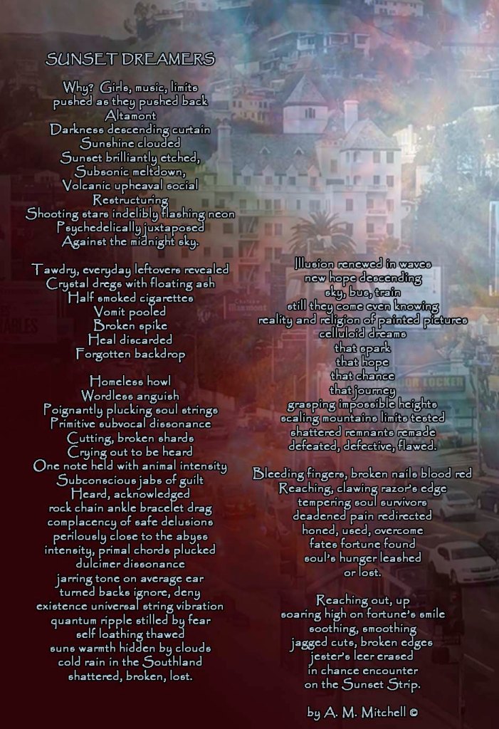 ByWalking up the Sunset strip I stopped in Book Soup and picked up a book I’d been looking for “Laurel Canyon The Inside Story of Rock and Roll’s Legendary Neighborhood” It just seemed so appropriate considering the neighborhood. I walked up the street, found a place to sit across from the Chateau Marmont just down the street from Laurel Canyon Blvd., up the street from the Rainbow Room, bought a cup of regular black coffee (pleasure to be found in simplicity) and started to read. Reading back in time to high school days, simpler times before legends died and reality set in. The contrast to what we thought was and what is, has, over time, become starkly apparent, realizing that survival, overcoming the odds, makes us all winners. We could all be that homeless person on the street howling in pain, lost, but we aren’t, at least not yet, and I began to write: