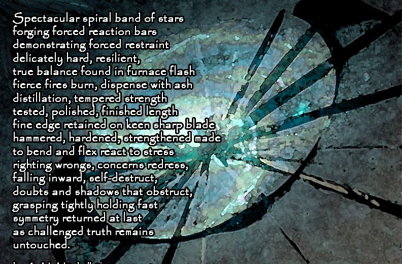 #Poetry #DigitalArt #BladeSmith’sFurnaceBrokenGlass #Astrophysics #Spectacular #SpiralBand #ForcedRestraint #FurnaceFlash #Distillation #TemperedSteel #SharpBlade #DoubtsAndShadowsSelfDestruct #Symmetry #TruthRemains #KKDMNC